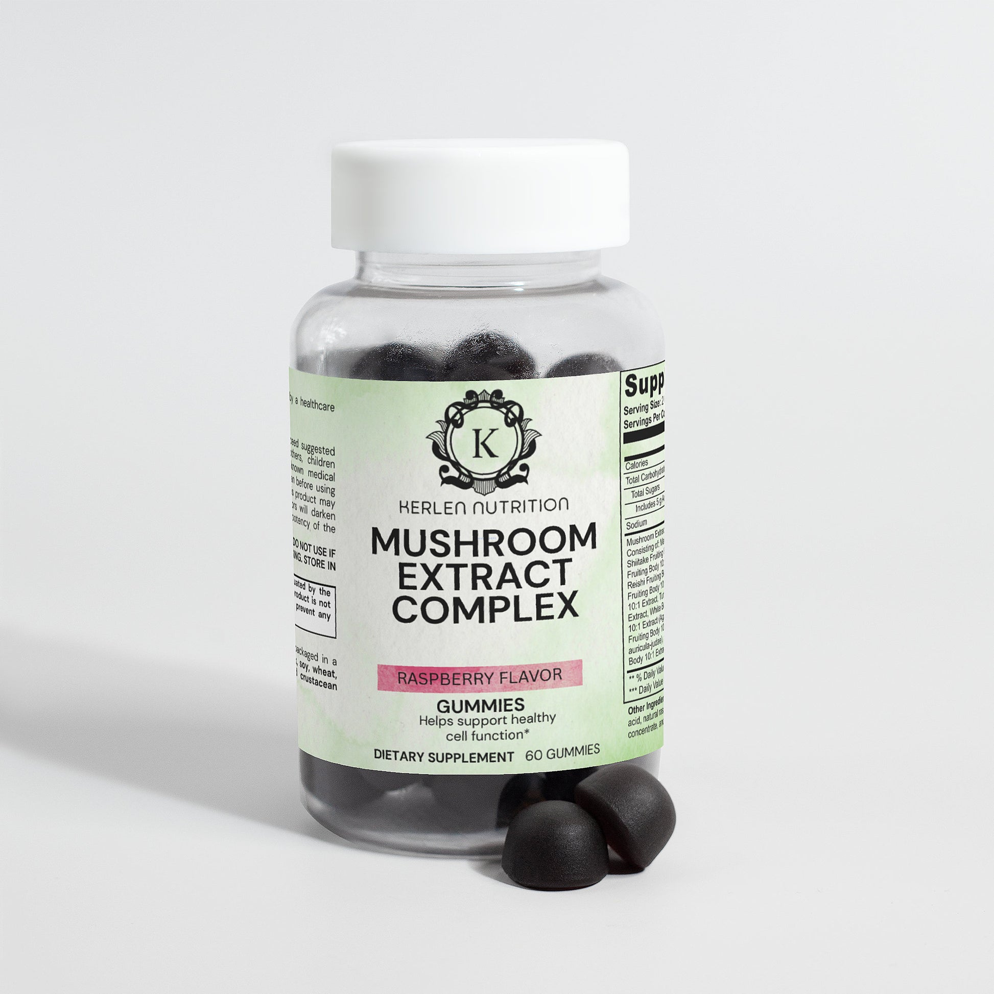Ingredients: Mushroom extract (Maitake Fruiting Body 10:1 Extract, Shiitake Fruiting Body 10: 1 Extract, Lion’s Mane Fruiting Body 10:1 Extract, Reishi Fruiting Body 10:1 Extract, Cordyceps Fruiting Body 10:1 Extract, Chaga Fruiting Body 10:1 Extract, Turkey Tails Fruiting Body 10:1 Extract, White Button Mushroom Fruiting Body 10:1 Extract, Black Fungus Fruiting Body 10:1 Extract, Royal Sun Mushroom Fruiting Body 10:1 Extract), glucose syrup, sugar, dextrose, pectin, citric acid, natural raspberry flavor, sodium citrate, purple carrot juice concentrate, palm oil (contains carnauba wax).